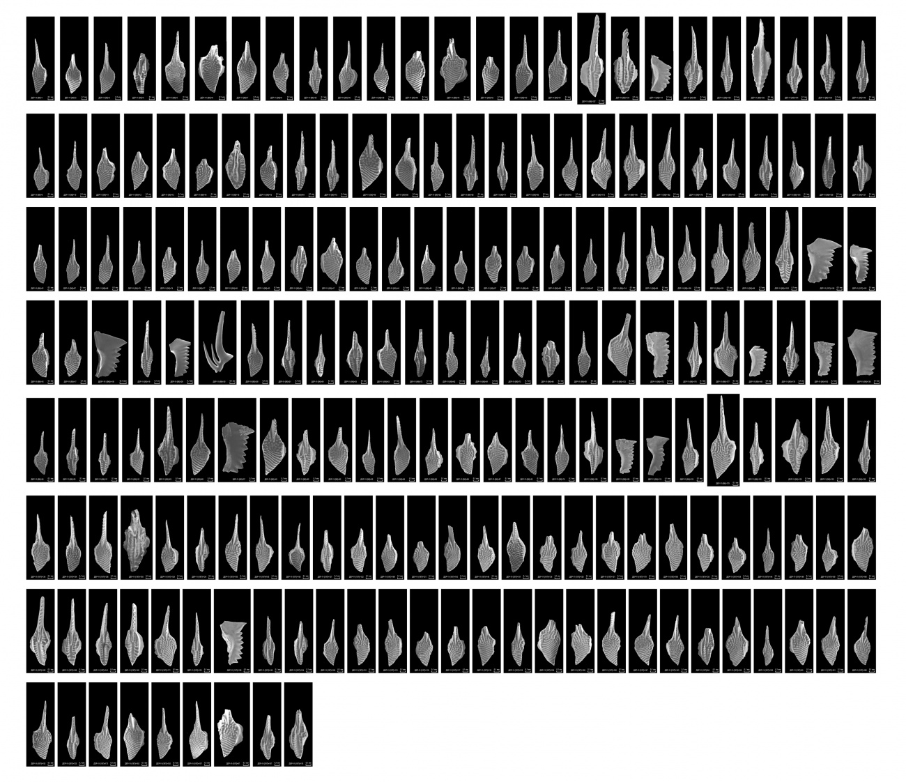 Содержание платформенных элементов конодонтов, по которым осуществляется их видовая диагностика и по которым выполняется биостратиграфическое расчленение и сопоставление разрезов, для отложений каширского подъяруса московского яруса среднего карбона в южной части Московской синеклизы обычно составляет первые десятки и до сотни Р-элементов на один килограмм породы. В последнем случае появляется возможность получить запредельно большое количество форм для анализа родовой и/или видовой изменчивости конодонтов. С этой целью стандартным способом было растворено в уксусной кислоте 13 кг известняков каширских отложений из береговых обнажений в нижнем течении р. Дёржи в Зубцовском р-не Тверской области. Из нерастворимого остатка было выделено более 2000 Р-элементов, точное число уточняется. На фотографии представлена малая толика форм, сфотографированных с помощью сканирующего электронного микроскопа.