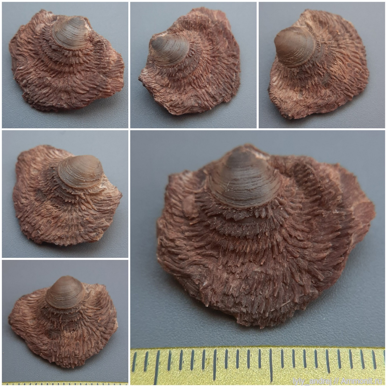 Эта брахиопода была куском глины, на месте слегка очистил, но не придал значения, что она какая-то странная, без особого энтузиазма положил в бокс. Дома отмыл от глины, и я разглядел "ворс" и обе створки.