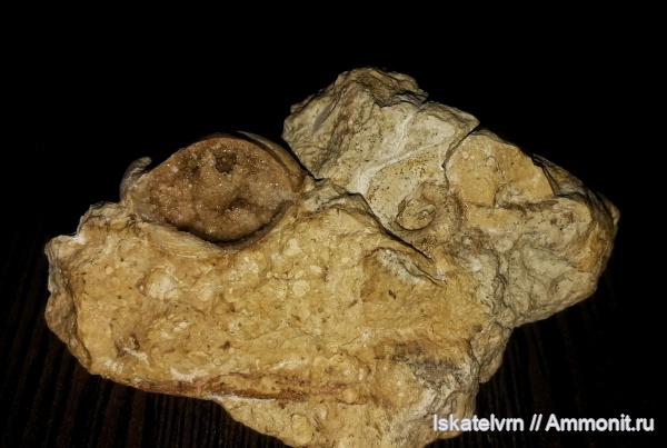 Гастропода (кажется Holopea) рядом с закварцованной брахиоподой (не удалось выяснить род) и червем.
