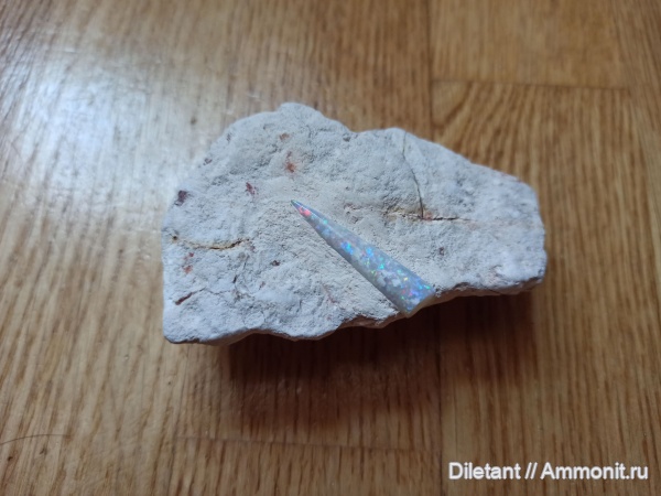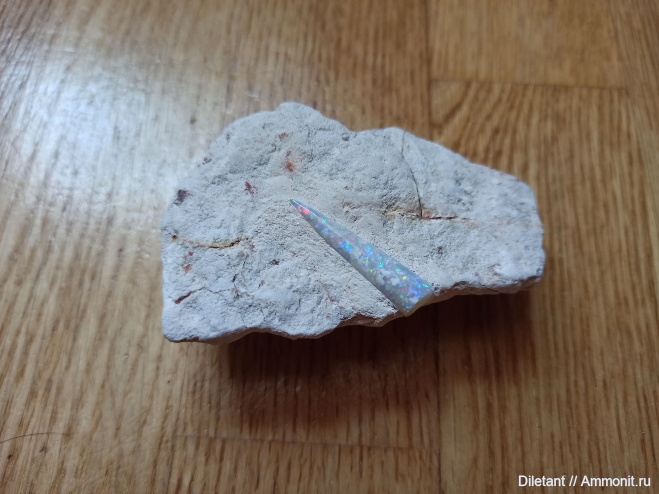 Хорошее приобретение! Там интересный механизм замещения был: сначала оригинальный кальцит белемнита напрочь растворялся, а потом в полости, оставшейся в породе, рос опал. | ||||||