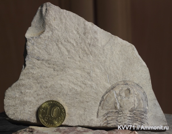 Образец из осыпи. Раскололся во время падения, но видно, что трилобит сохранился целым. Этот слой мы не нашли. Большой трилобит, ширина панциря составляет 4 см. Интересно, что здесь же был найден фрагмент головного щита с каймой шириной 6-7 см, наверное этот трилобит был более 15 см длинной.