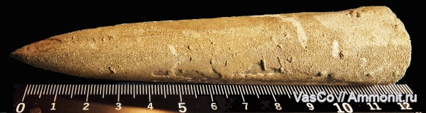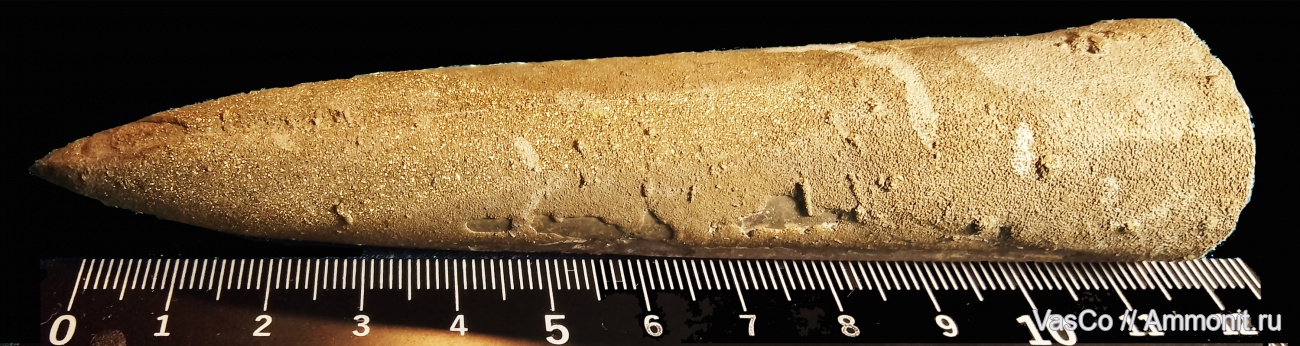 Белемнит частично покрытый тонким слоем пирита и сверкающий под лучами солнца, как елочная игрушка.