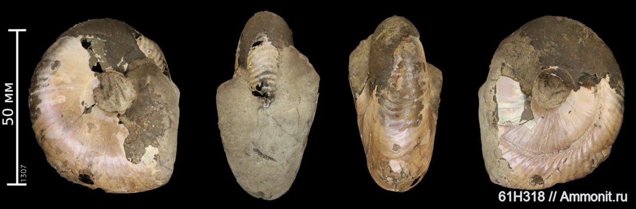 Этому Funiferites'у повезло меньше, чем предыдущему - травма задела мягкие ткани, появился шрам на раковине (4й вид) и перекосило скульптуру (3й вид). Начало повреждения находится под тёмной коркой, и расчистить его не удалось.