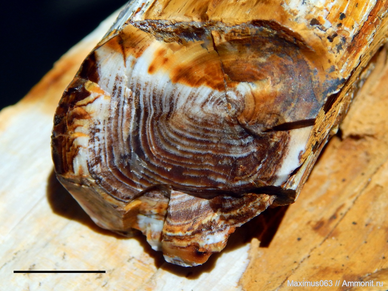 Небольшая веточка опализированного дерева. Длина масштабной линейки 1 см. Интересно, такое большое количество колец на маленькой веточке говорит о частой смене климата, или это годовые кольца, и, в таком случае, растение очень медленно росло?