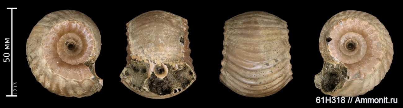 Слой 0.45-0.65 м. То ли вид другой, то ли с ростом размера относительная ширина меняется - не выглядит данный Erymnoceras сильно широким. У более позднего и маленького аммонита и относительная ширина оборота больше, и прирост ширины немаленький.