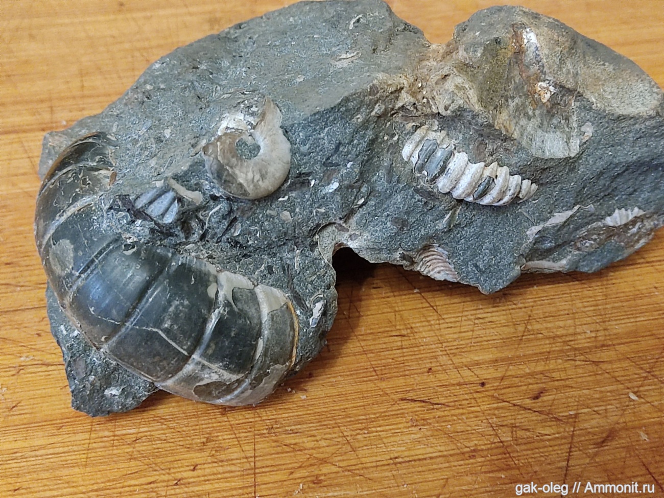Образец найден в Адыгее, на реке Белая, там же был найден зуб ископаемой лошади.Образец интересен разнообразными формами древней жизни океана Тетис, которые представлены в одном куске камня. Как считают специалисты здесь три вида аммонитов.