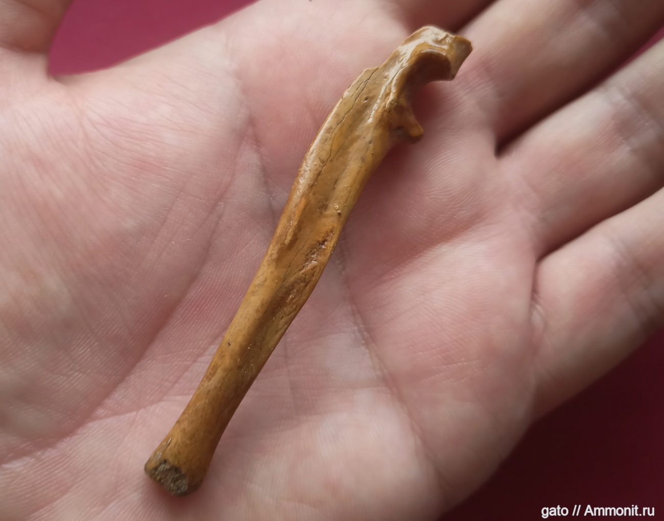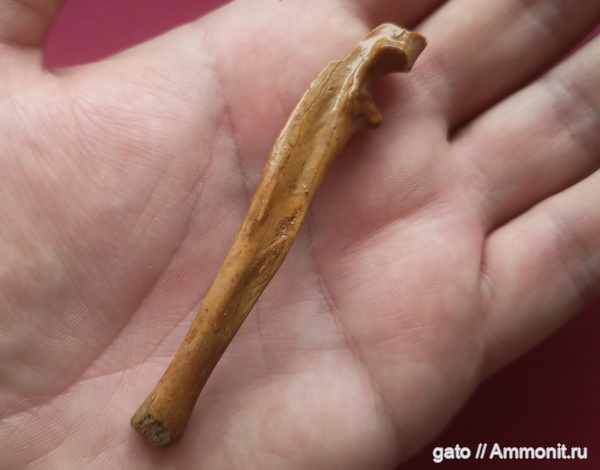 Не мамонтами едиными:) Тоже старая находка из 90х, несколько лет назад я пытался ее определить и пришел к локтевой кости барсука. Теперь решил пересмотреть, появились иные варианты. Хорошо виден цвет местного плейстоцена. Головка кости неполная. Покрыто лаком.