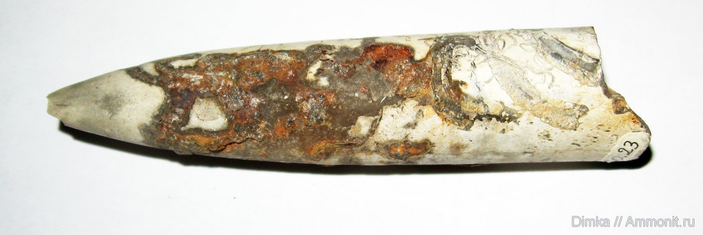 Ржавый цвет на ростре обусловлен тем, что прикрепленные серпулы были пиритизированы и вследствии контакта с внешней средой заржавели.