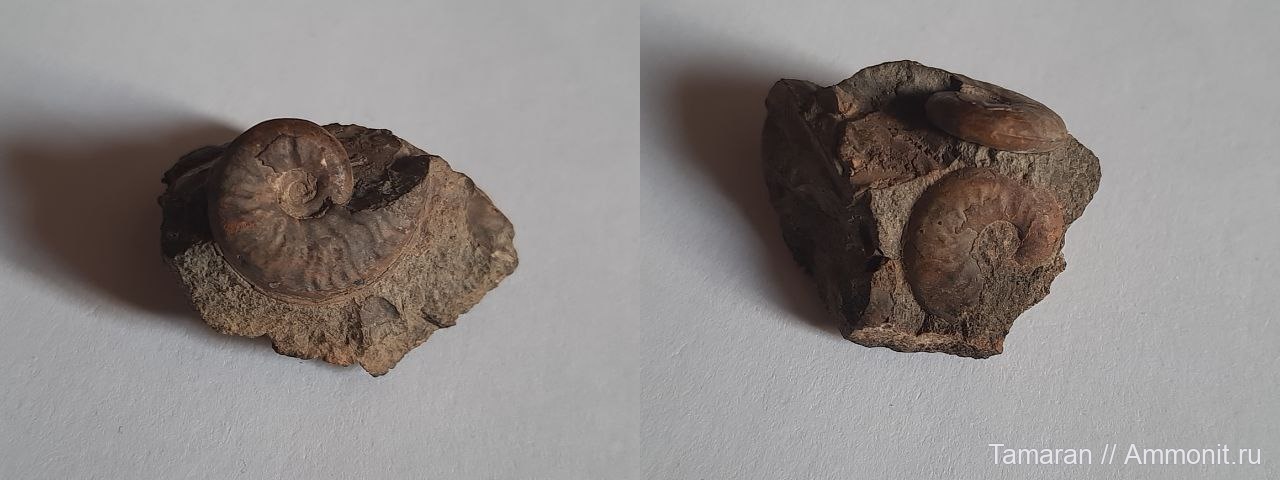 Аммониты Leioceras opalinum Reinecke, 1818 из аалена Карачаево-Черкессии. Получены по обмену с Андреем (ds3944). Диаметр - 1,8 и 1,1 см.