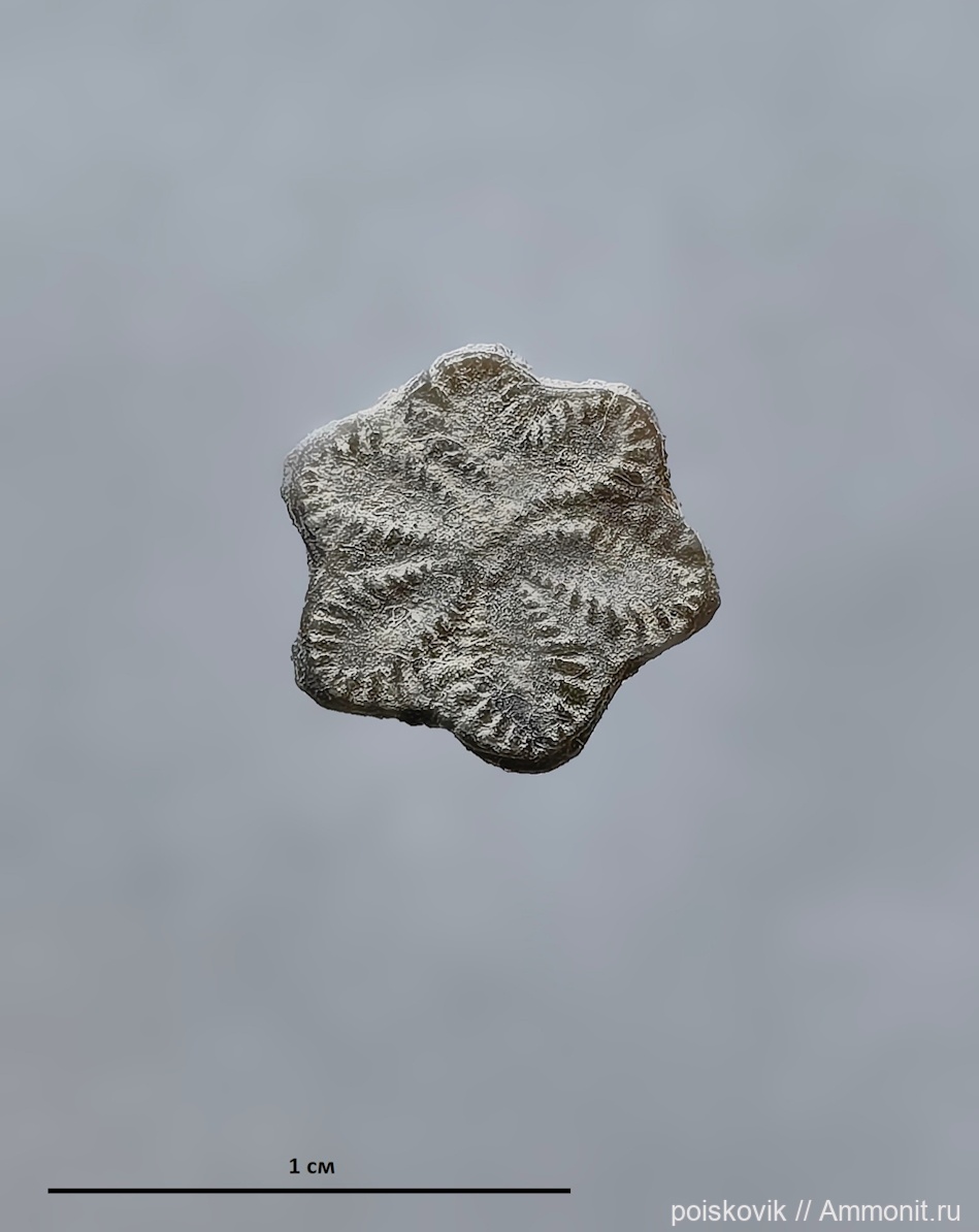 Очень редкая находка: 6-ти лучевой членик морской лилии Isocrinus диаметром 8 мм. Встречаются, в основном, 5-ти лучевые членики, а подобный экземпляр попался нам впервые.