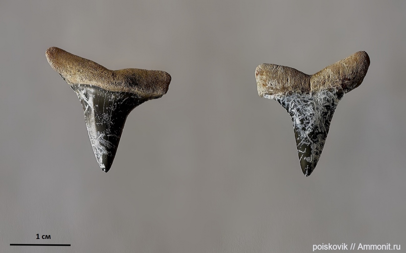 Зуб акулы Macrorhizodus в 2-х проекциях из эоценовых отложений.