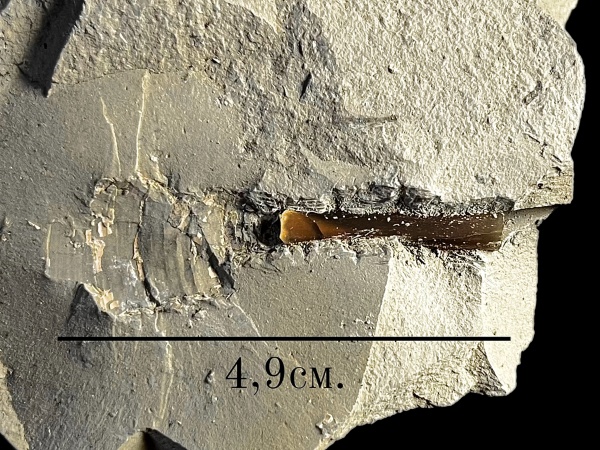 Фрагмент белемнита с остатками фрагмакона в прижизненном положении. Частично сохранился перламутр. Образец найден на отвалах Михайловского ГОКа из келловейских глин.