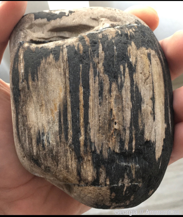 Прогуливаясь по пляжу в Махинджаури( пригород Батуми), среди галек вулканического происхождения ( гранит, диорит, андезит и т.д.) я нашёл этот кусок окаменелой древесины. Долго гадал откуда он взялся, пока не нашёл статью в интернете с описанием окаменелого леса (Годердзи), где описывается средне миоценовый лес который исчез в ходе вулканизма, возможно что не далеко от этого места брали гальку для пляжа. А так же севернее в Гурии есть описание мест с миоценовой флорой.