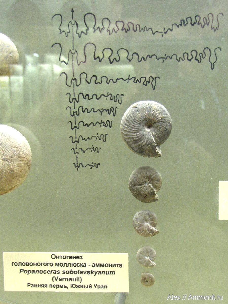 Аммониты Popanoceras sobolevskyanum разного возраста. Видно, как по мере взросления менялась их раковина. Сверху - схема лопастной линии. Род Popanoceras относится к семейству Popanoceratidae отряда Goniatitida.