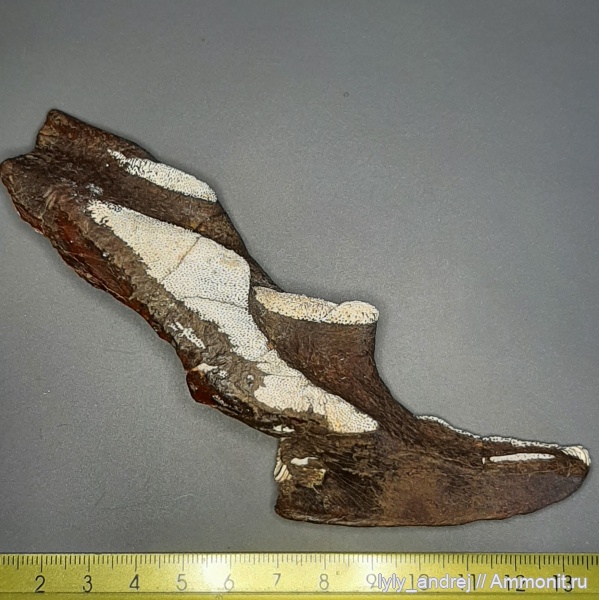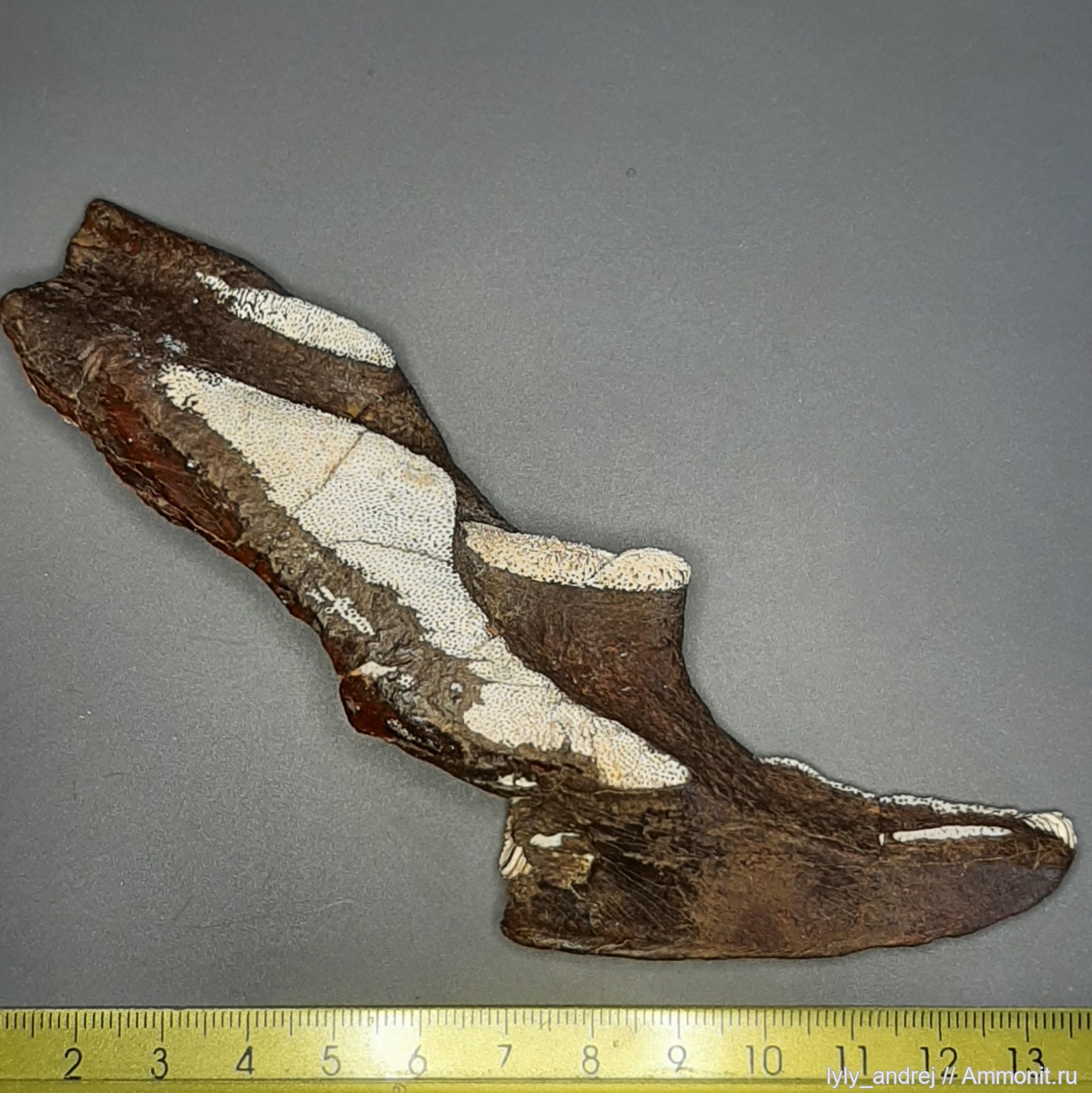 Edaphodon sedgwicki, левая мандибулярная пластина от особи среднего размера. Пластины наиболее крупных особей этого вида в 2-3 раза крупнее, но в наших регионах такие крупные в песчаных фациях верхнего мела вряд ли можно найти, их нужно искать в более глубоководных (карбонатных) отложениях | ||||||