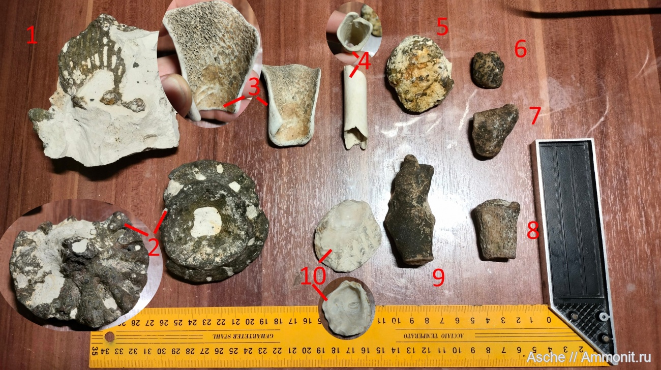 В этом году ещё раз съездил в Новодевичье (Шигонский р-н Самарская обл.) Никаких зубов акул и ящеров к сожалению не нашёл (меловой период). Только губки и еще некоторые находки. №10 - осколок иноцерамуса, на сколько он большой был не понятно. Губки 8 и 9 уже находил ранее, но вид не известен мне. №1 и 2 - предполагаю что губки. Если можно подскажите вид и т.д. №3 и 4 похожи на обломки костей (окаменелые), особенно №4, но не уверен.