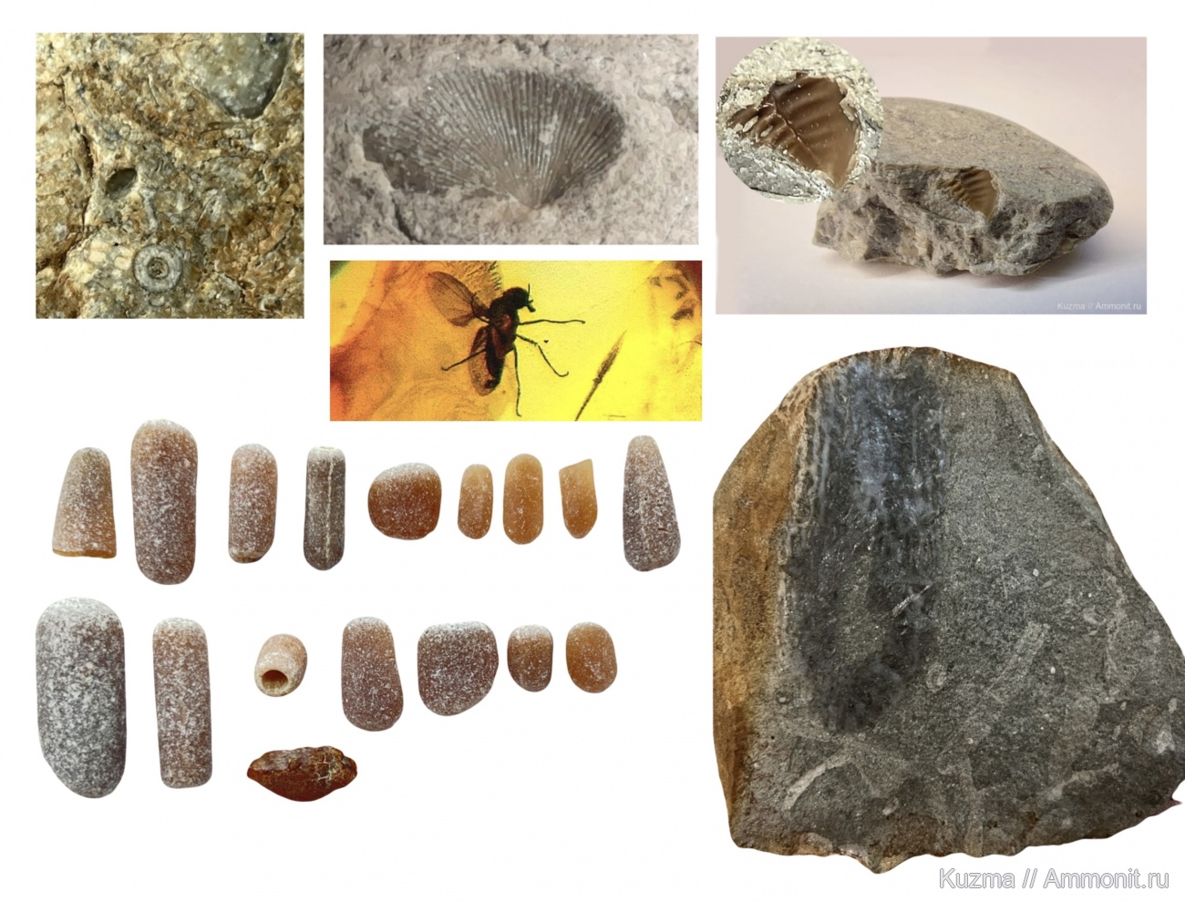 Гуляя по пляжам Балтийского моря Калининградской области, можно обнаружить окаменелости. На фото фрагмент морской лилии, брахиопода, инклюз(не моя находка), мелкий пигдий трилобита, обточенные водой фрагменты ростров белемнитов, камень с губкой и мшанками.