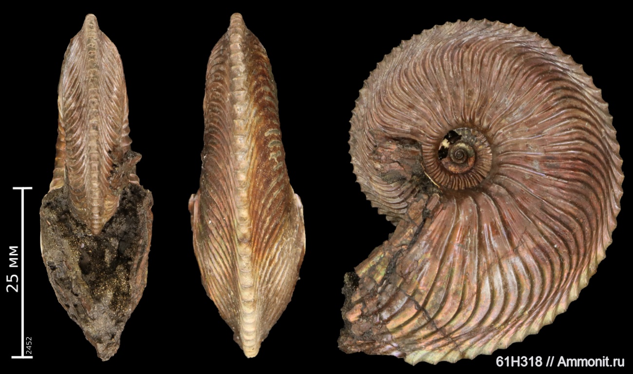 По сравнению с остальными найденными Cardioceras'ами сходного размера имеет наименее грубую скульптуру. Вообще, в чёрной глине мне попадались лишь аммониты без перламутра из пирита серого цвета, так что находка "цветного" образца несколько неожиданна - сразу закрадываются мысли, а не стоило ли верхнюю границу глины побольше копать)