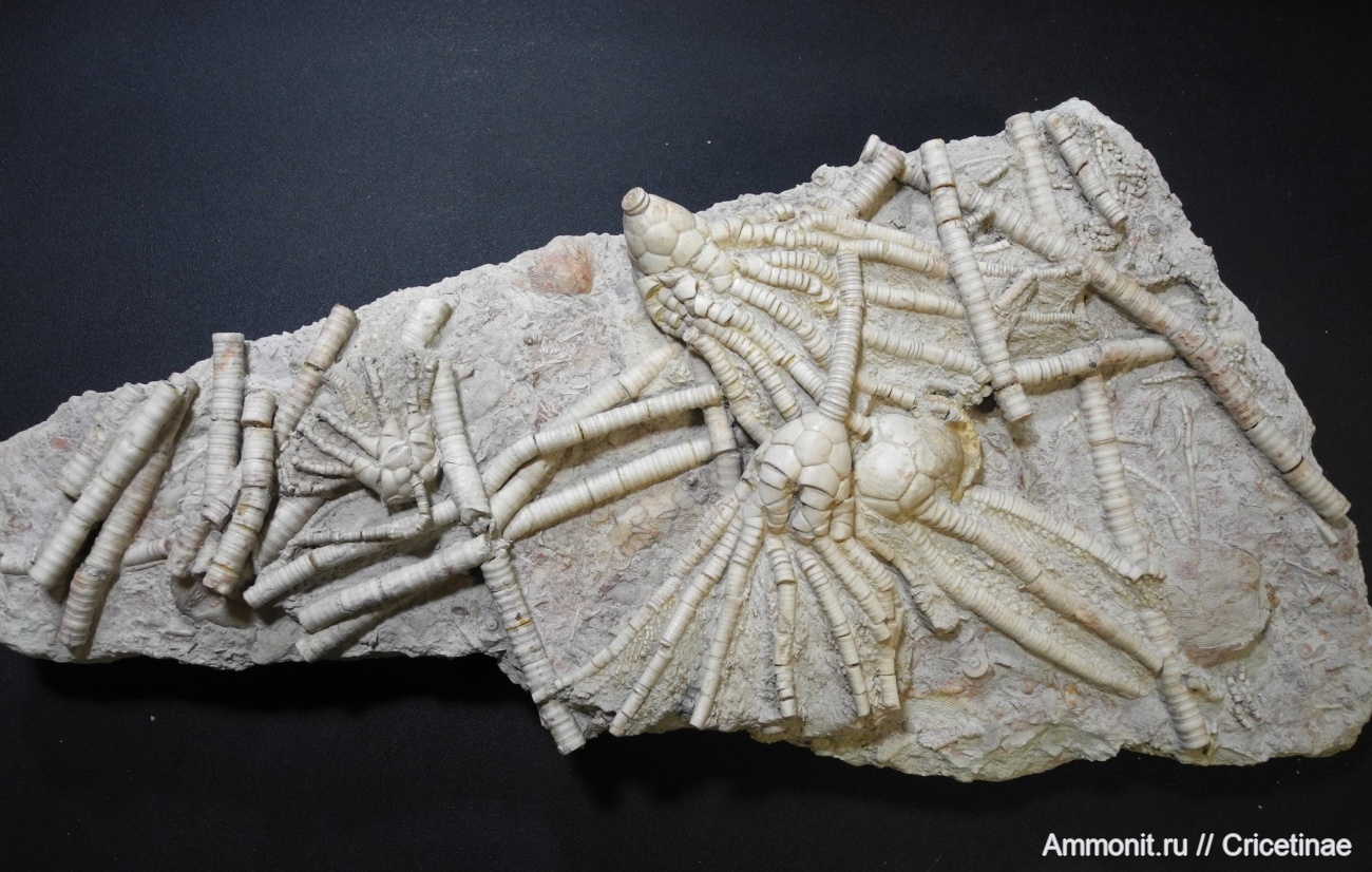 Плитка с 4 лилиями: две Moscovicrinus, одна Cromyocrinus, одна Aesiocrinus. Размер плитки 38 см. Образец подвергся значительной реставрации. Приобретение. Если какую лилию неверно определил, то прошу поправить.