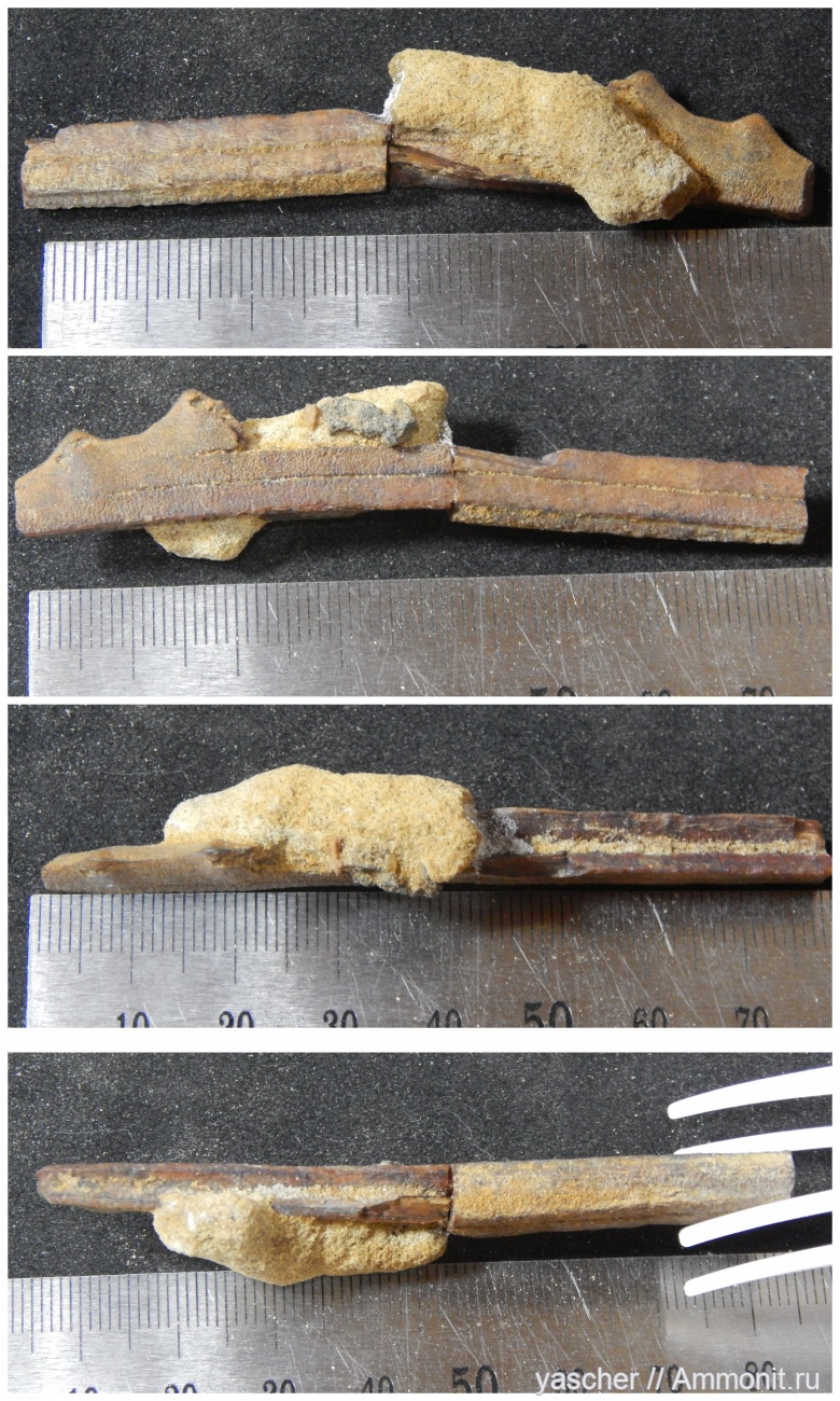 вот такая штучка, даже не знаю как к ней обращаться, вроде бы остатки некоей зубной пилы.Склеена из двух частей.Инхофоссилию, приклеившуюся сбоку удалять не рискнул, может со временем и осмелюсь.Все остальное, что можно сказать - на фото.