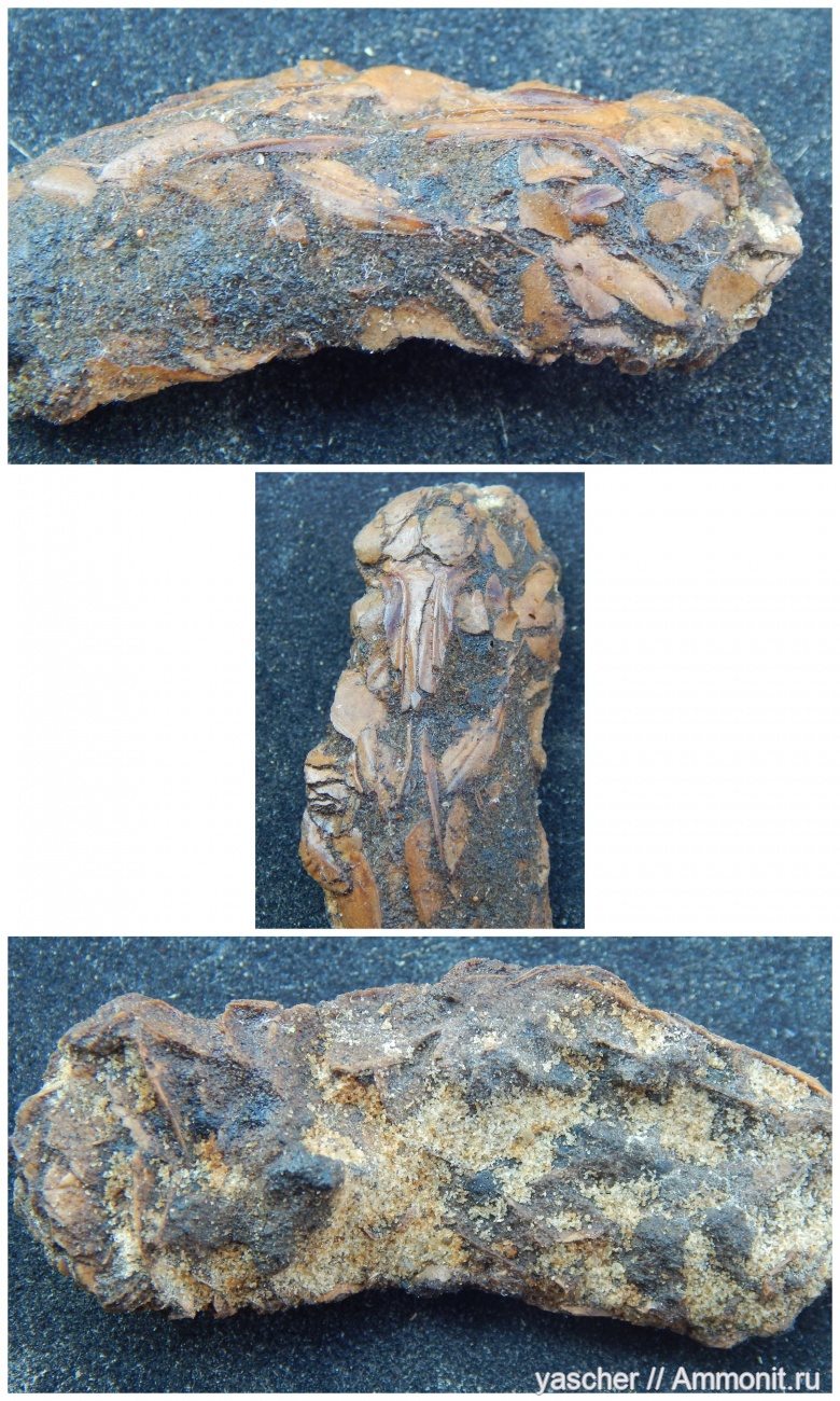 И снова здравствуйте.очередная голова рыбы(?) в инхофоссилии(?).Вот все таки есть у меня сомнения по поводу этих конкреций.Сдается мне, что это здоровенный копролит здоровенного червя.Ракообразное измололо бы хитин и кости в пыль.И в ходах эти образования никогда не бывают крупнее 40 - 50 мм.Вот эта 45 мм.Может мне мерещатся призраки и воображение слишком разыгралось, но здесь мне видится череп рыбки.