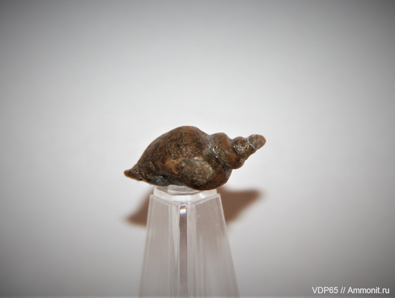 Образец полностью освобожден из матрикса. Так мне больше нравится и место экономит. Но намучался я с этой брюхоножкой немало:) Сначала при вырезании её УШМкой от основного куска породы, камень выпал из тисков, и с моим везением удар пришелся непосредственно на ракушку, что привело к скалыванию кусочка того, что раньше было раковиной.