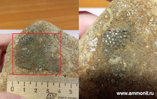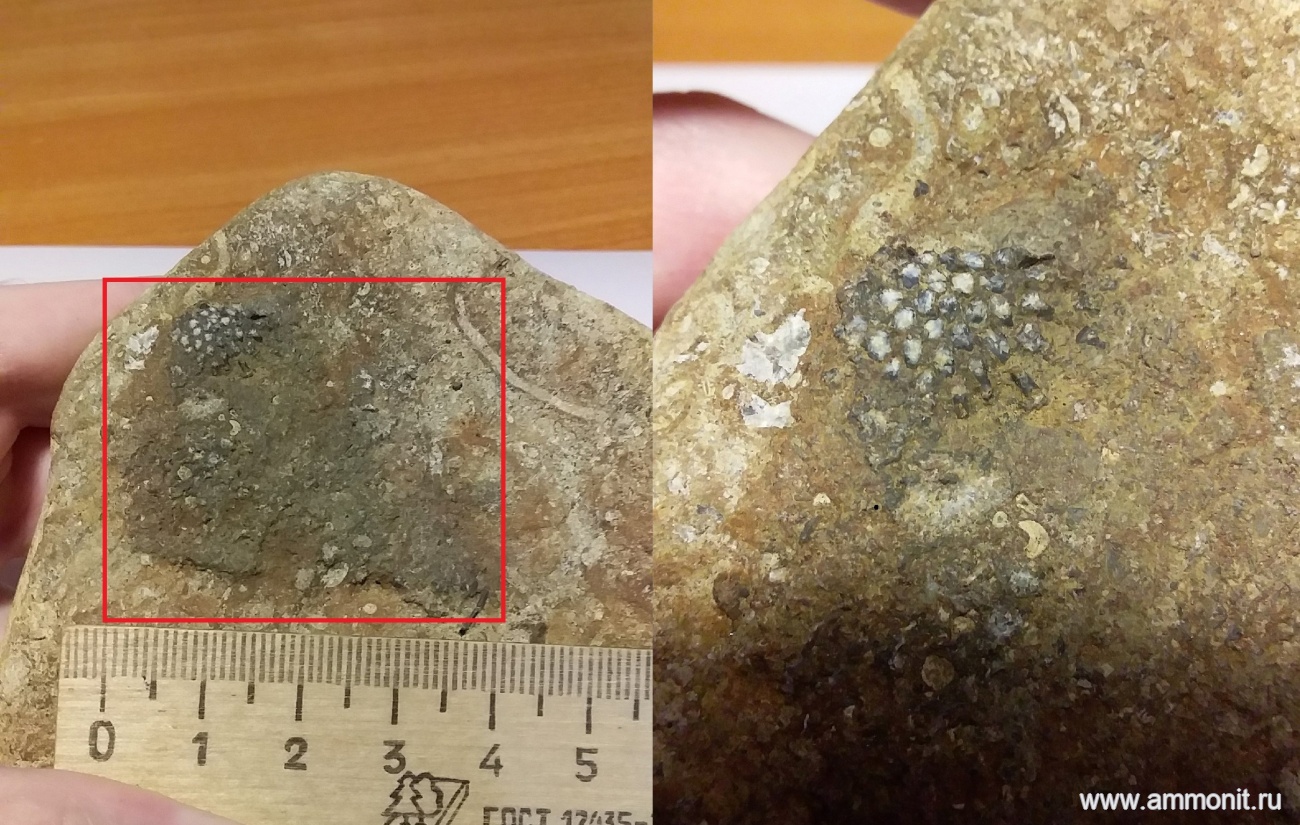 Найден камень с чем-то, напоминающим обрывок по форме, на своей поверхности (Левая сторона фото, обведено рамкой). Большая часть "обрывка" стерта, однако на краю проступает своеобразный рельеф, смахивающий на чешую (Правая сторона фото). Буду признателен тем, кто подтвердит или опровергнет мою гипотезу.