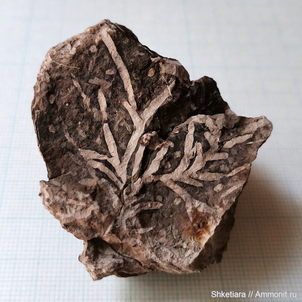 Находка с отвала черных оксфордских глин в Пирочах. Порода этого фрагмента, кажется, та же самая, из которой состоят многочисленные конкреции на отвале. Поверхность выглядит как более-менее свежий скол. На ней видна светлая ветвистая структура. "Веточки" чуть-чуть выступают над окружающей породой, как будто более стойкие механически и/или химически. У них заметна какая-то толщина, хоть очень скромная, но явно не отпечатки. И не видно никаких характерных признаков, которые позволили бы отнести их к какому-то определенному типу. Мшанки? Кораллы? Ихнофоссилии? Водоросли?