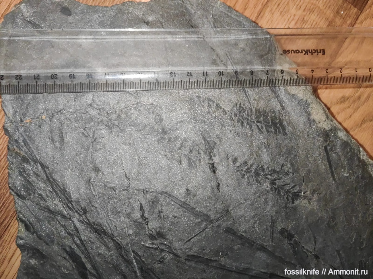 Найден 05.08.24 на ручье Балка Никитина. Находится на плите размером 40×22 см, на которой, помимо него еще несколько стеблей хвощей, листья Neuropteris и каламиты.