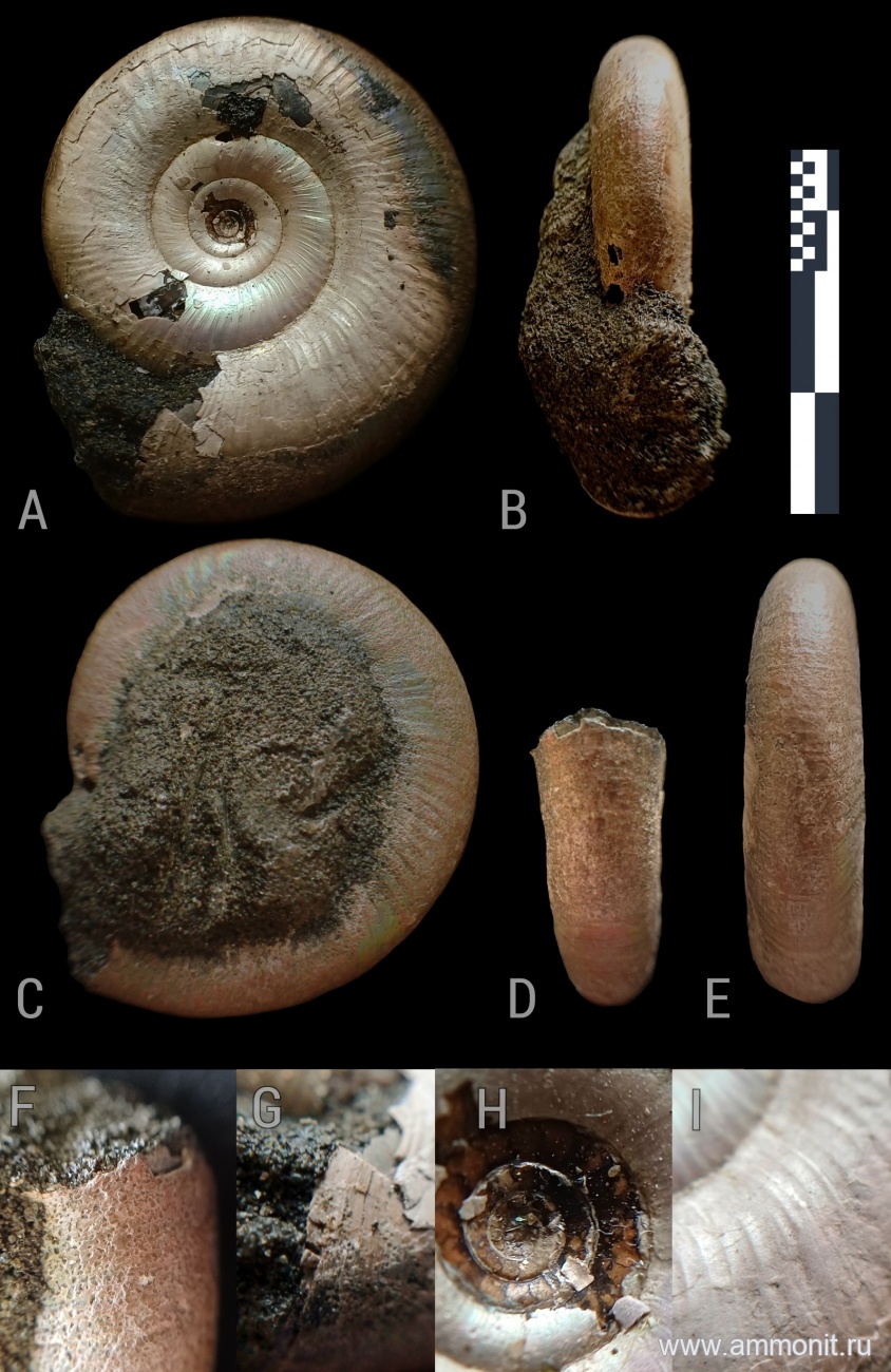 Kachpurites sp., найденный при раскопках в верхней части зоны Ep.nikitini (предположительно подзона Ep.lahuseni) филёвского парка на втором ручье. Окружающий слой состоял из плотных неперемытых глин, при этом сильно отличался от встреченных выше слоёв зоны K.fulgens. Сопутствующими находками были обломки аммонитов Epivirgatites sp., многочисленные брахиоподы Mosquella oxyoptycha и Russiella spp., при этом не были встречены аммониты Lomonossovella sp. и Virgatites sp. Возможно, данный образец является одной из наиболее ранних форм рода Kachpurites и имеет достаточно хорошую сохранность. На рисунке A — фото сбоку (сторона при обнаружении была покрыта фосфоритом), B — фото вентра со стороны устья, C — фото сбоку (сторона контактировавшая с глиной), D — фото вентра с устьем, E — фото вентра напротив устья, F — фото части устья, находившейся в глине, G — фото сохранившейся части устья, H — фото остатков протоконха, I — фото рельефа раковины на 5 обороте.