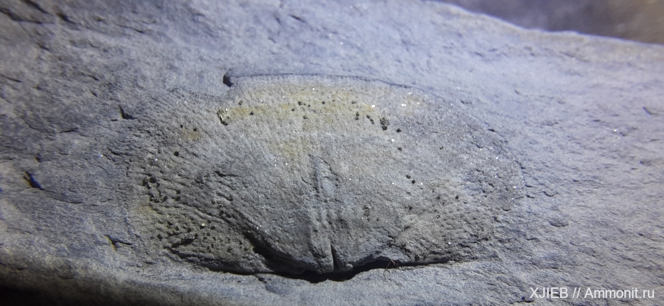 На поверхности раковины блестят кристаллики пирита.