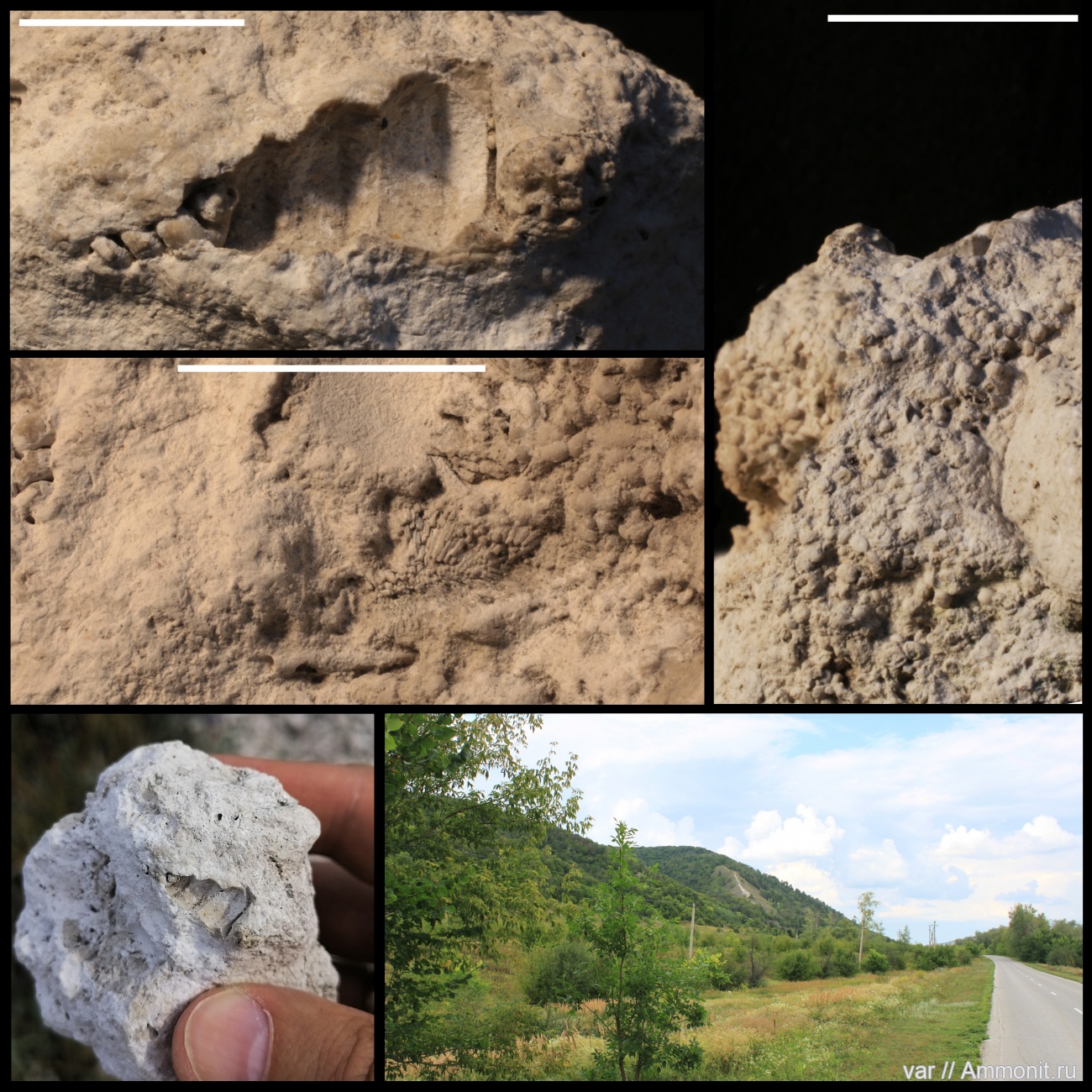Значительная часть образца «нафарширована» округлыми «зернышками» размером 0.5-1.0 мм., часть из которых полые. Детали строения и скульптуры не просматриваются по причине то ли плохого сохрана, то ли их отсутствия. «Зернышки» видны справа от хететиса и на правом верхнем фото. Могу осторожно предположить, что это оолиты – минеральные образования в виде шариков или эллипсоидов. Другие варианты: остракоды, фораминиферы или диноцисты. Против первого варианта говорит «слишком округлая» форма. Два других варианта вызывают сомнение из-за отсутствия выраженной структуры. Хотя один-два полых «шарика» как будто разделены на некие камеры, однако при таких размерах уверенно говорить о каких либо деталях строения «шариков» нельзя.