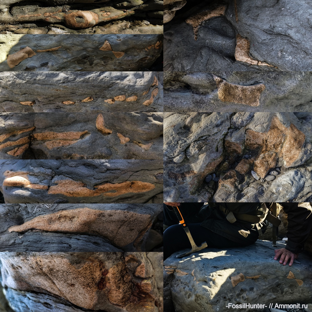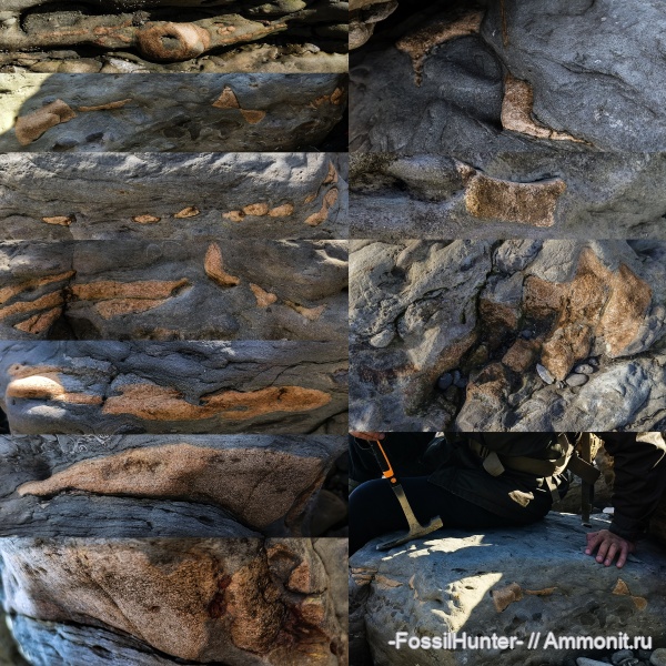 Пока погода решила побаловать меня теплым денечком, заехал на новое место и получается закрыл гештальт! Нашел захоронение ихтиозавра, с костями черепа, ребрами, позвонками, целым коракоидом(?). Даже плечевая вроде присутствует на срезе. Какая красота откроется при очистке от породы даже не представляю!!! По моим скромным расчетам длинна зверюги около 3х метров, может несколько больше. Некоторые фото получились не очень удачно, может в этом сезоне еще раз посмотрю и более качественно отсниму. Правая нижняя фото для понимания размеров.
