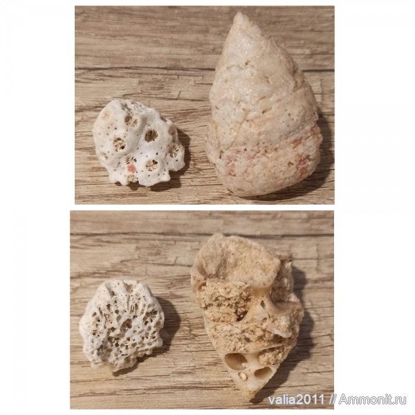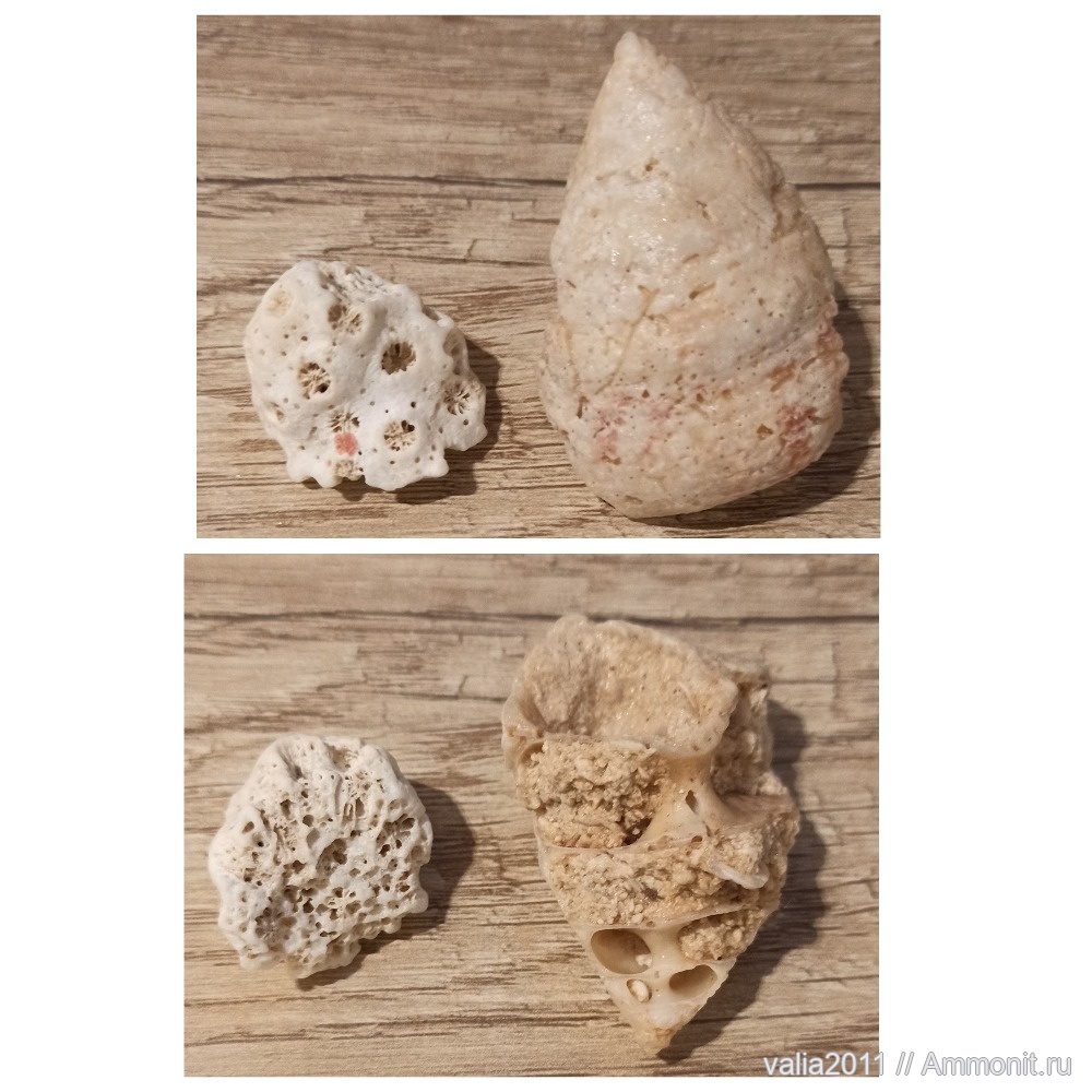 Это Tectus справа, современная раковина, сильно окатанная, подрастворенная, но где-то даже окраска сохранилась. Определить до вида будет трудно. | ||||||