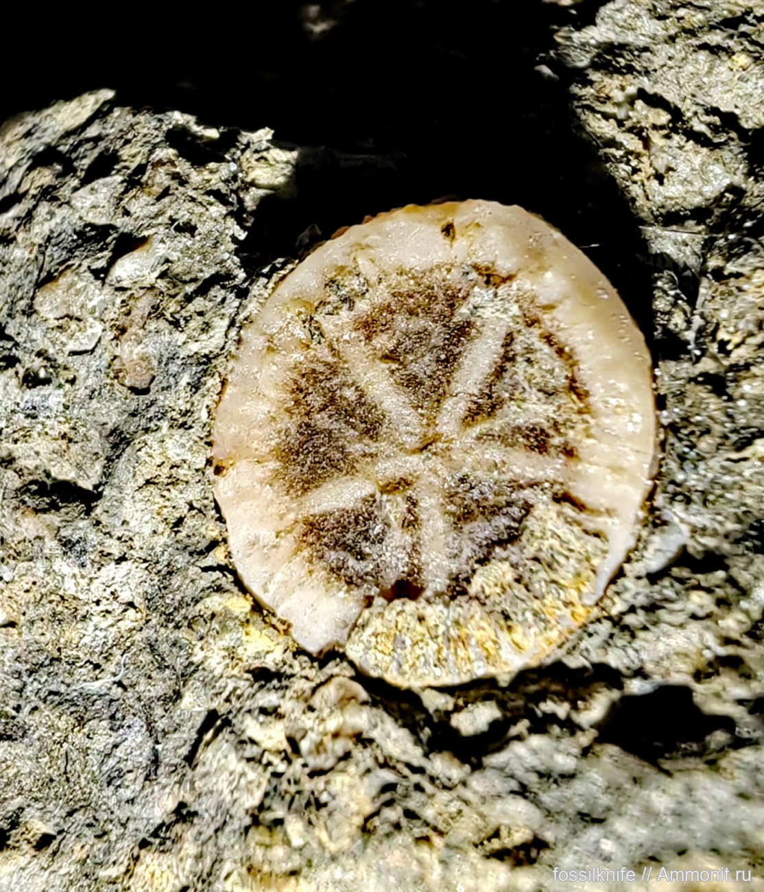 Найден 12.10.24 на обнажении криноидных известняков в районе устья р. Сюк. Благодарю ув. GM за определение