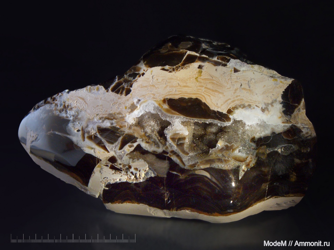 Образец интересен скорее с эстетической, чем с палеонотлогической точки зрения. Строматолиты сильно деформированы, рассечены брекчиевыми участками и полостями с кристаллами кварца. Тем не менее решил показать. Обработка/полировка своими силами.