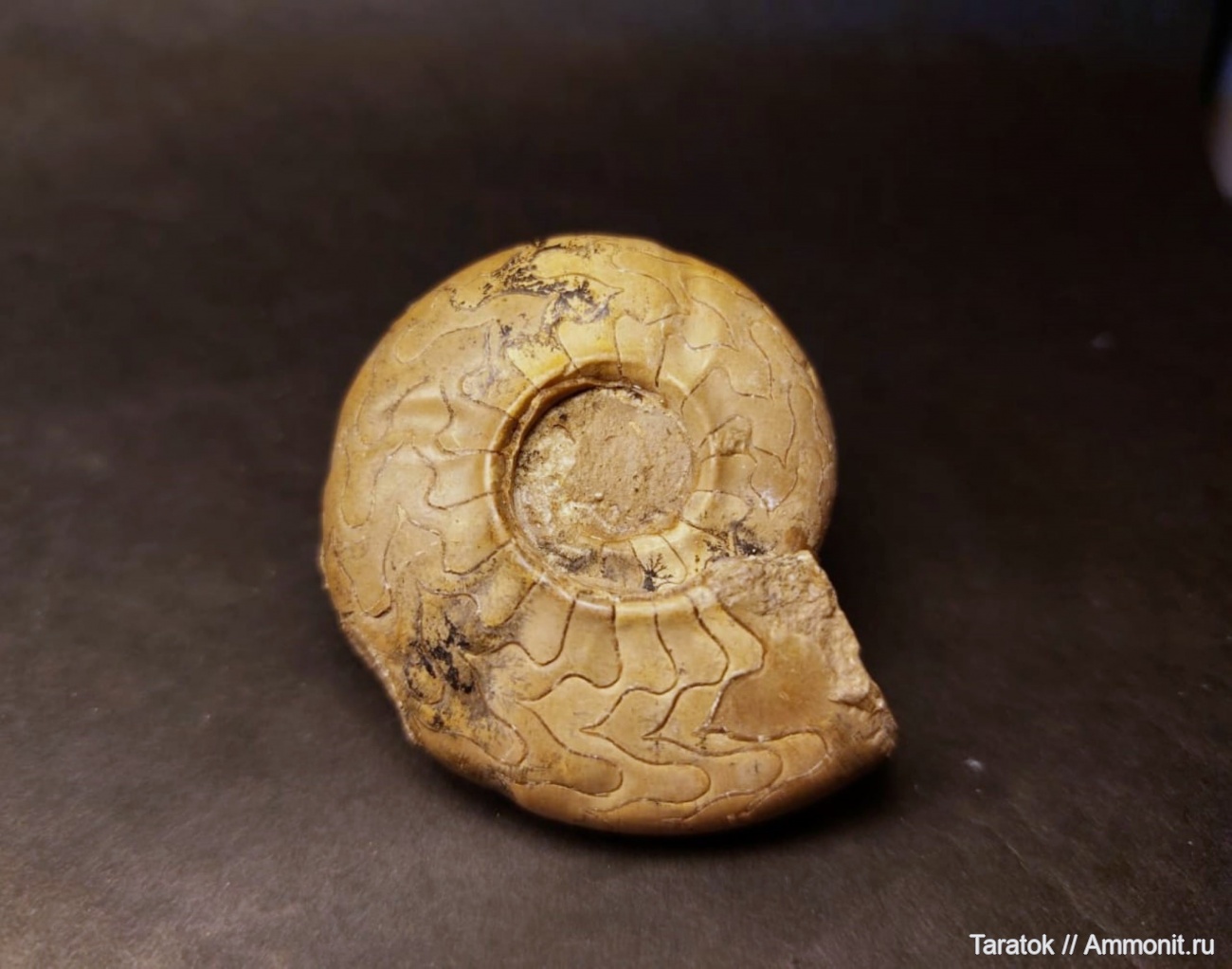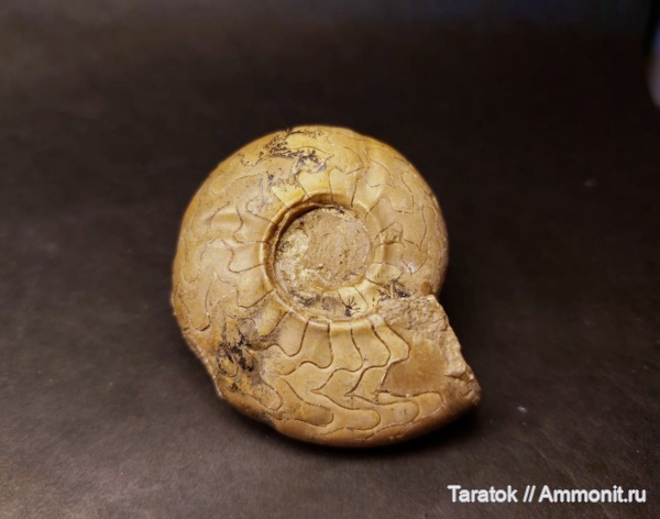 Почему-то этот аммонит кажется более «упитанным», чем предыдущий. Не хватает ракурса со стороны вентра. | ||||||