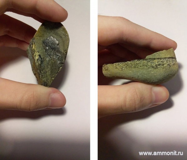 Такой вот обломок был найден на пляже. На сколе имеет блеск, как у угля. Виднеются прожилки с четкой черной гранью над ними.
