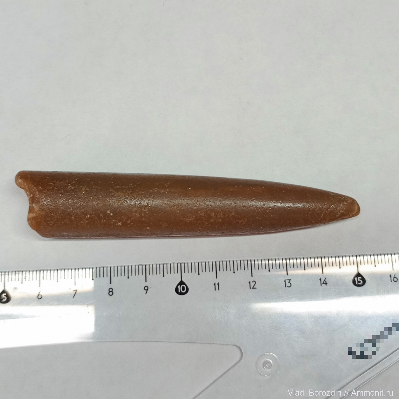 На фото представлен ростер белемнита. Длина ростера 9 см. Был обнаружен на территории Калининградской области.