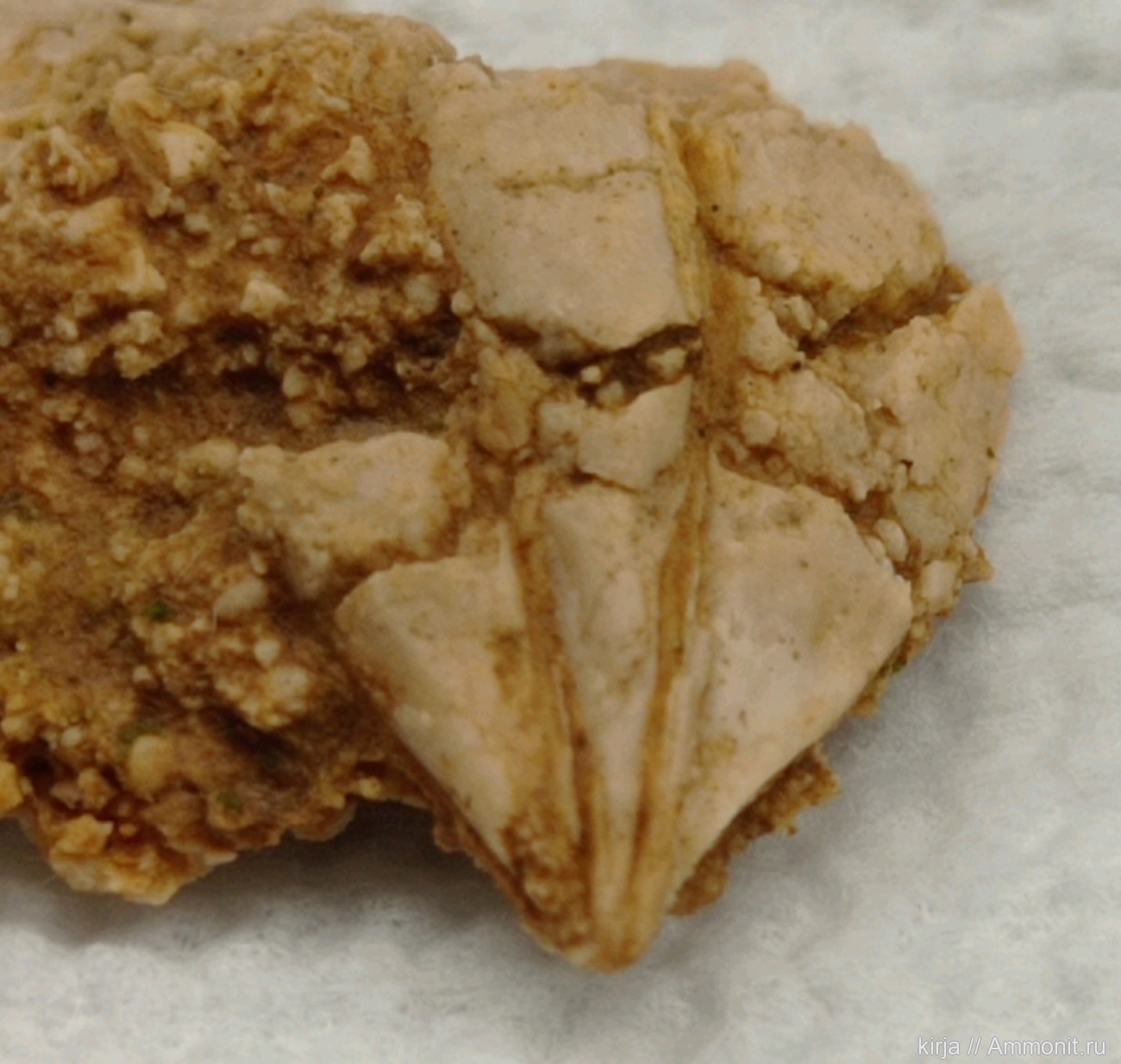 Найдена в ориктоценозе с губками и иглокожими. На фрагмент брахиоподы непохоже и их там небыло. С учетом хорошей сохранности мелких окаменелостей в данном слое штука необычная. Высота около 150 мм., края немного загибаются, тонкие но объемные. Не обломок чего-либо, непохоже