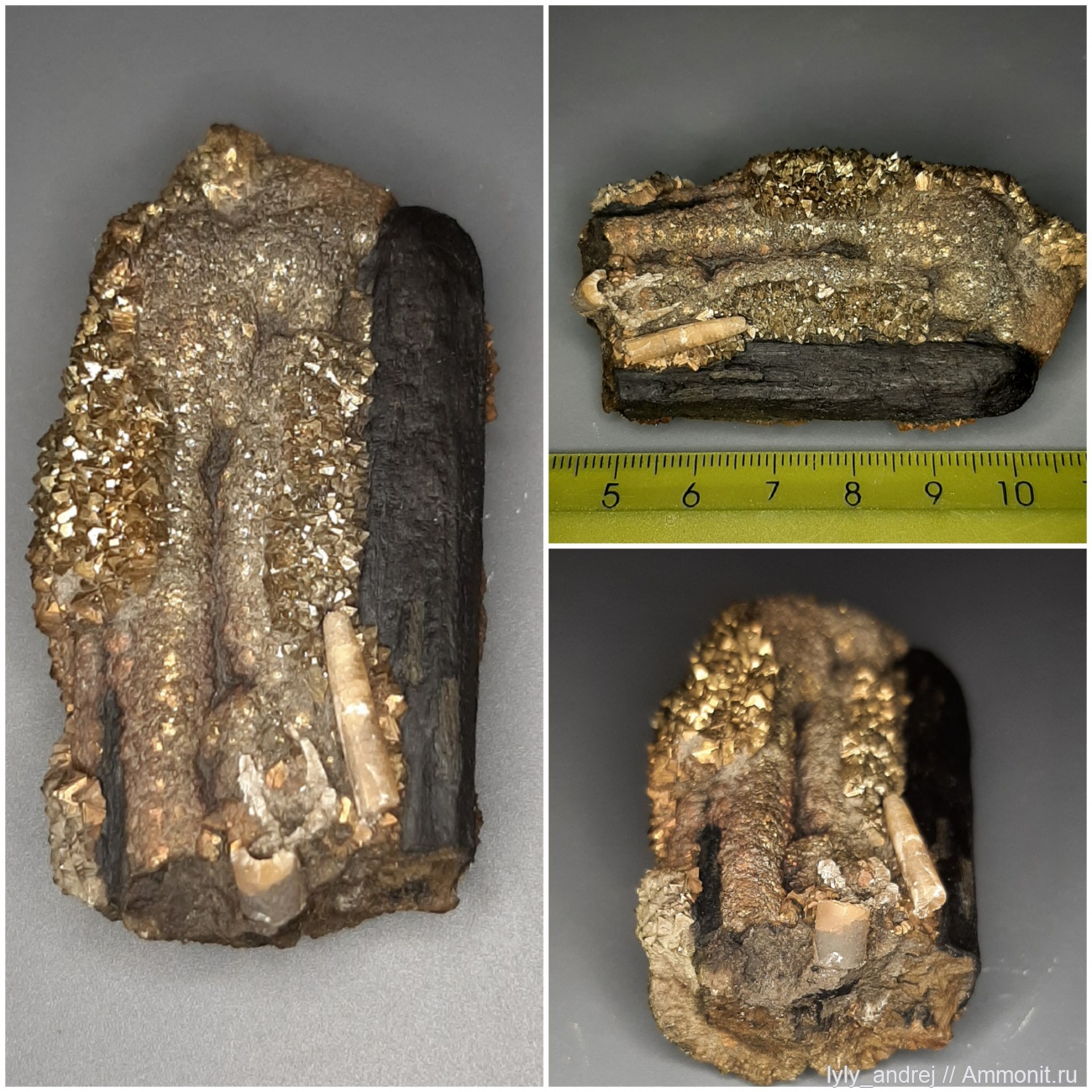 На этом кусочке дерева, покрытым кристаллами пирита, "приклеелись" обломочки от ростров белемнитов.