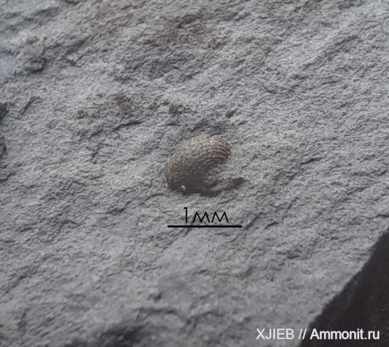 Брюшная створка какой-то продуктиды. На переднем плане ушко, далее частично видна макушка | ||||||