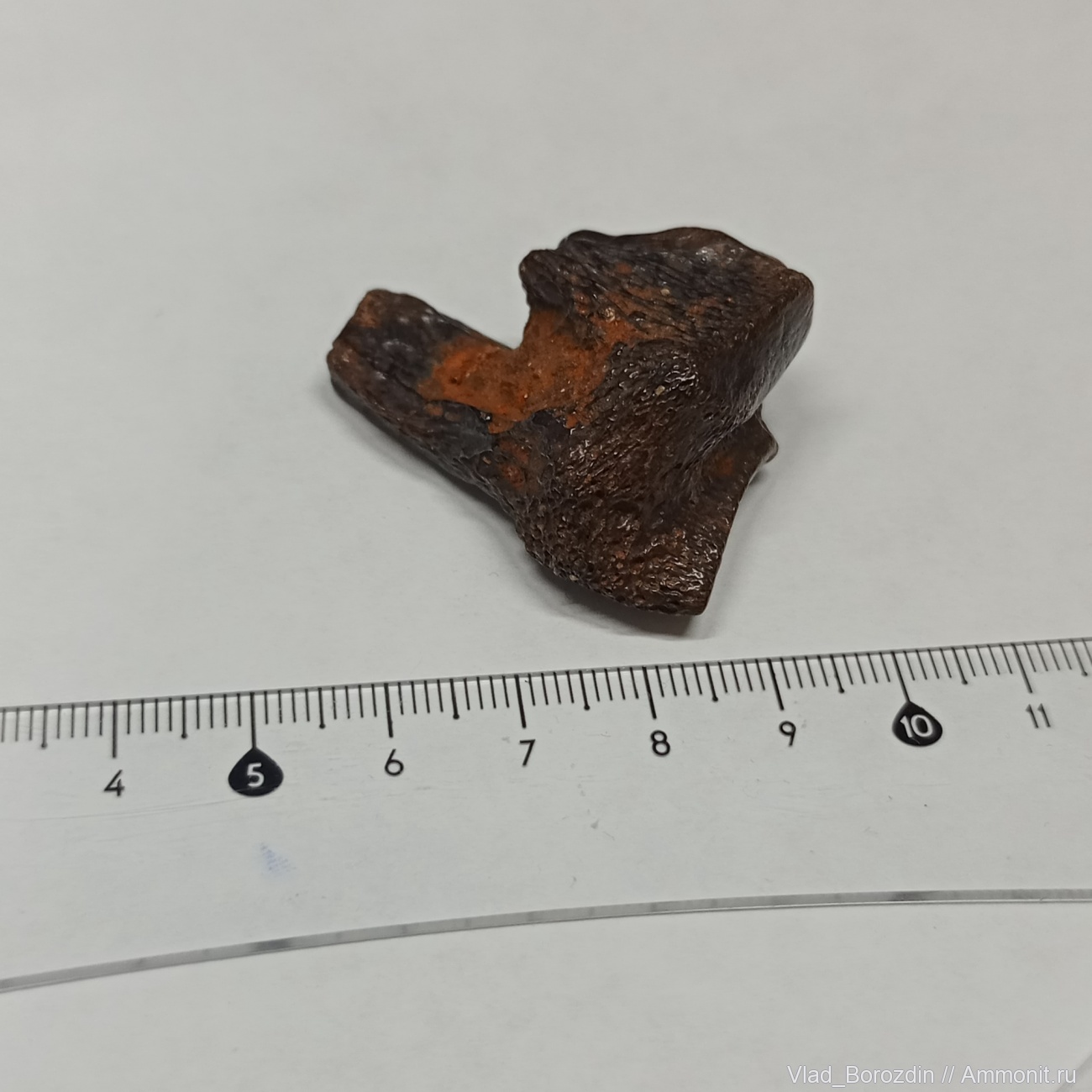 На фотографии некрупный кусок бедренной кости. Был обнаружен в Омске около реки Иртыш. На нем есть красная глина. Длина ее 4,5×3 см. Скорее всего эта часть мамонтовой фауны Антропогена.