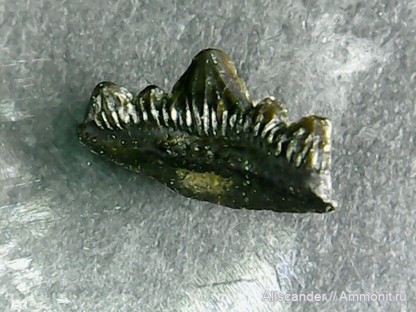 Образец из мергелей, Тульская область. Лабиальная сторона; ширина в пределах 4-5 мм. Лингвальная сторона: Фото. Вероятно (скорее всего) ювенильный.