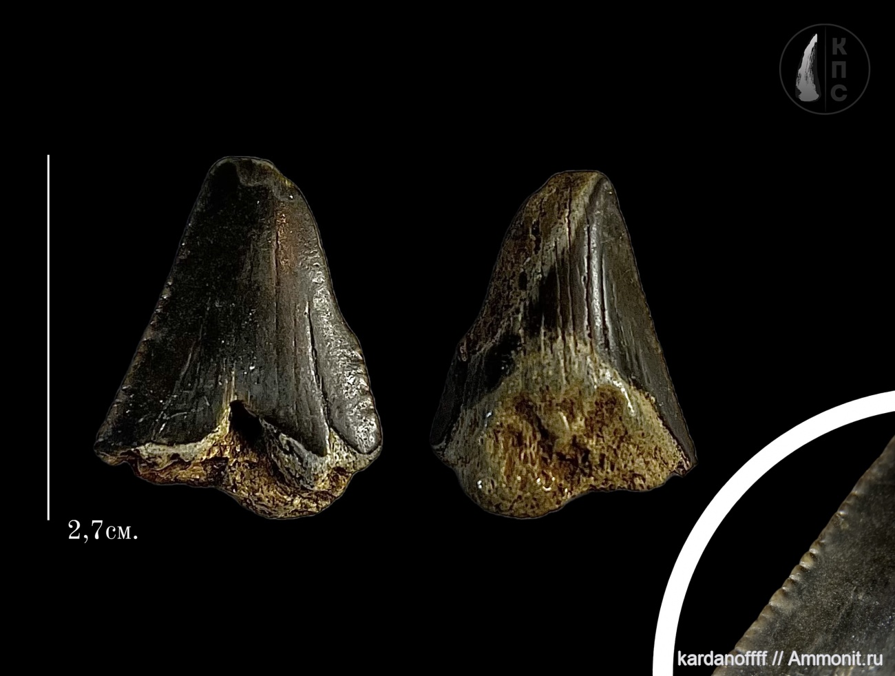Фрагмент зуба Otodus sp. с сохранившимися зазубринами. Найден в Курской области в Обоянском районе из отложений Эоценового возраста из слоя фосфоритов.