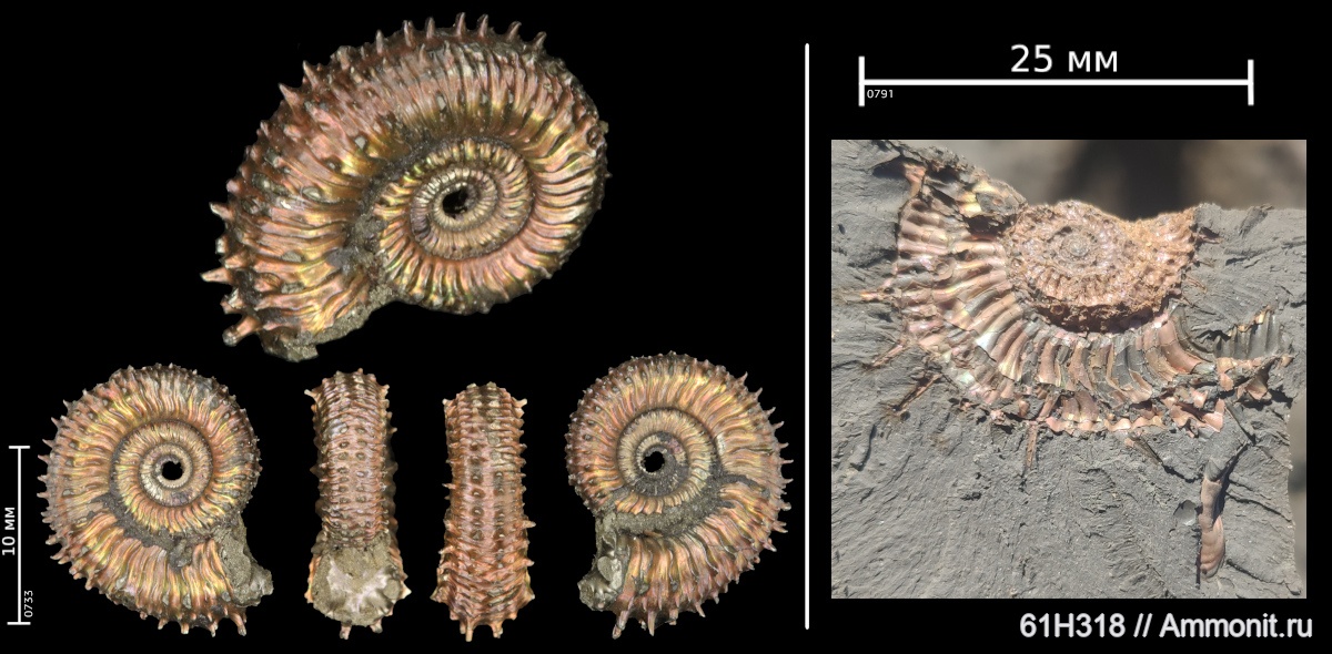 Самые длинные шипы мне попадались в случае обрастания аммонита пиритом (и на этом, кстати, тоже поверх перламутра есть ошмётки). Но счистить его обычно нереально, так что длинные шипы+хоть какой-то сохран раковины - действительно редкость редкая... | ||||||