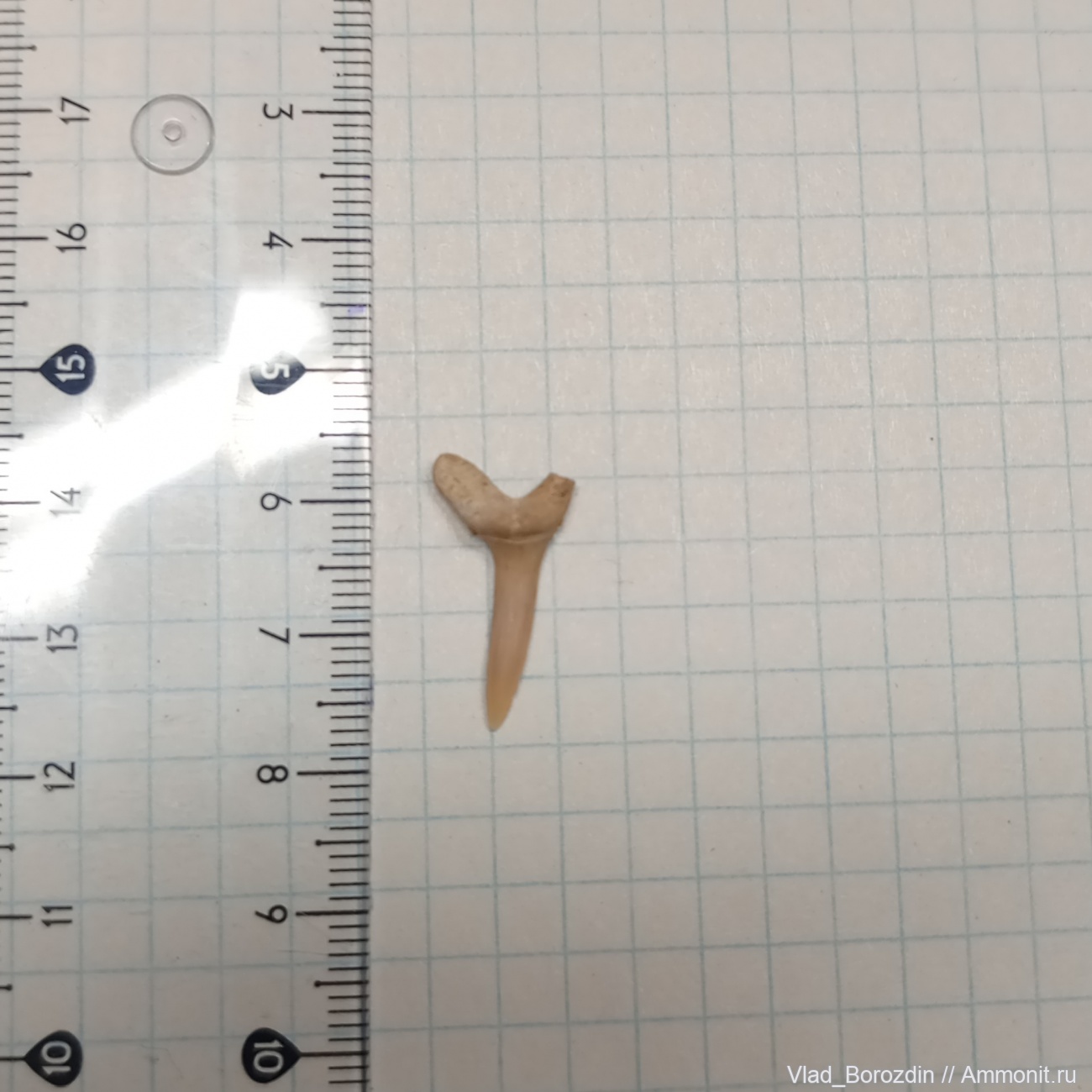 На фото небольшой зуб акулы Carcharias acutissima. Длина зуба примерно 2 см (если считать с корнем). Возраст находки Эоцен.