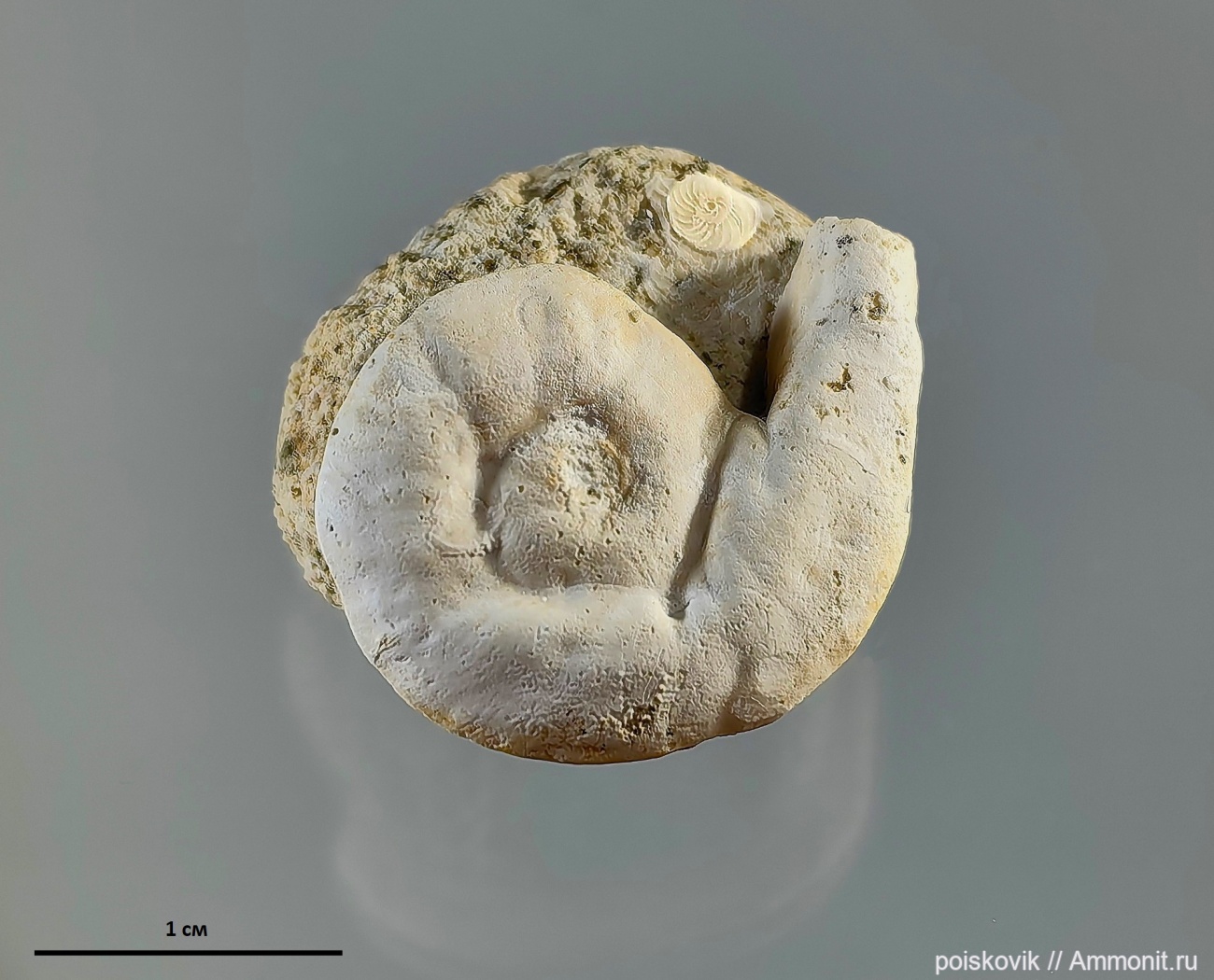 Серпула Rotularia spirulaea найдена в нуммулитовых известняках карьера у с. Пролом. Серпула принадлежит к вымершему роду планиспирально закрученных многощетинковых червей.