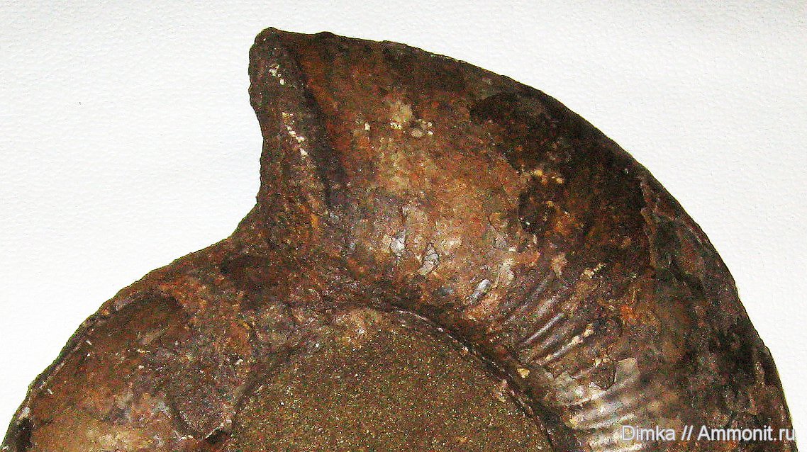 Устье аммонита Laugeites aenivanovi с близкого расстояния. Общий диаметр раковины около 41 см.
