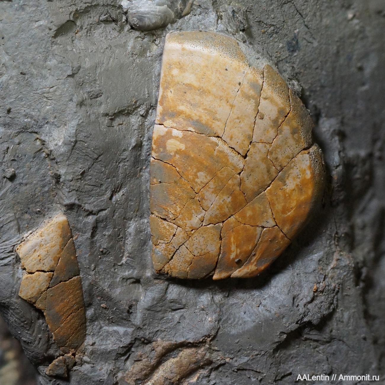 Ниже аптихов, сбоку на куске глины, открыты остатки перламутра аммонита Aulacostephanus.